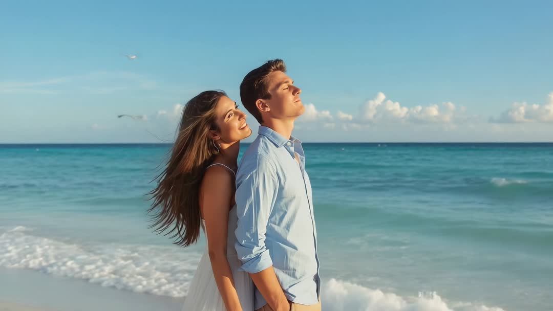 AI Generated Video. Visual features vibrant setting of beach with couple in casual attire standing back-to-back, signifying romance and relaxation. True embodiment of coastal tranquility with visible horizon and birds. Useful for campaigns focused on travel, romance, summer getaways, or lifestyle content emphasizing connection with nature.
