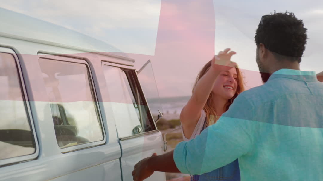 Scene captures an adventurous couple in front of a vintage van near the ocean. The carefree atmosphere is perfect for themes of travel, romance, freedom, and exploring new destinations together.