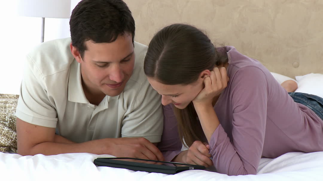 - Couple Enjoying Tablet Together in Bedroom Relaxation Scene