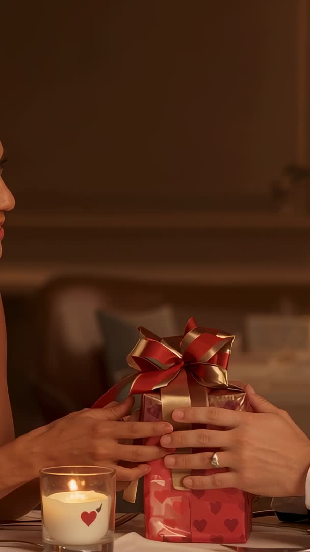 AI Generated Image. Vertical video frame showing close-up of couple exchanging wrapped gift at candlelit table. Hands reaching across frame, red and gold bow catching warm light, ring visible on male hand. Lit candle with heart motif adding soft glow and romantic atmosphere. Warm low-key lighting and shallow depth of field keeping focus on hands and gift while background remains softly blurred. Suitable for romantic marketing, Valentines promotions, restaurant date night ads, jewelry and gift shop campaigns, blog posts about relationships, social media vertical adverts, greeting card video covers, anniversary and proposal teasers. Vertical orientation working well for Instagram Stories, TikTok, Snapchat, mobile landing pages and digital ads. Color palette of warm reds and golds complement holiday and romantic-themed projects.