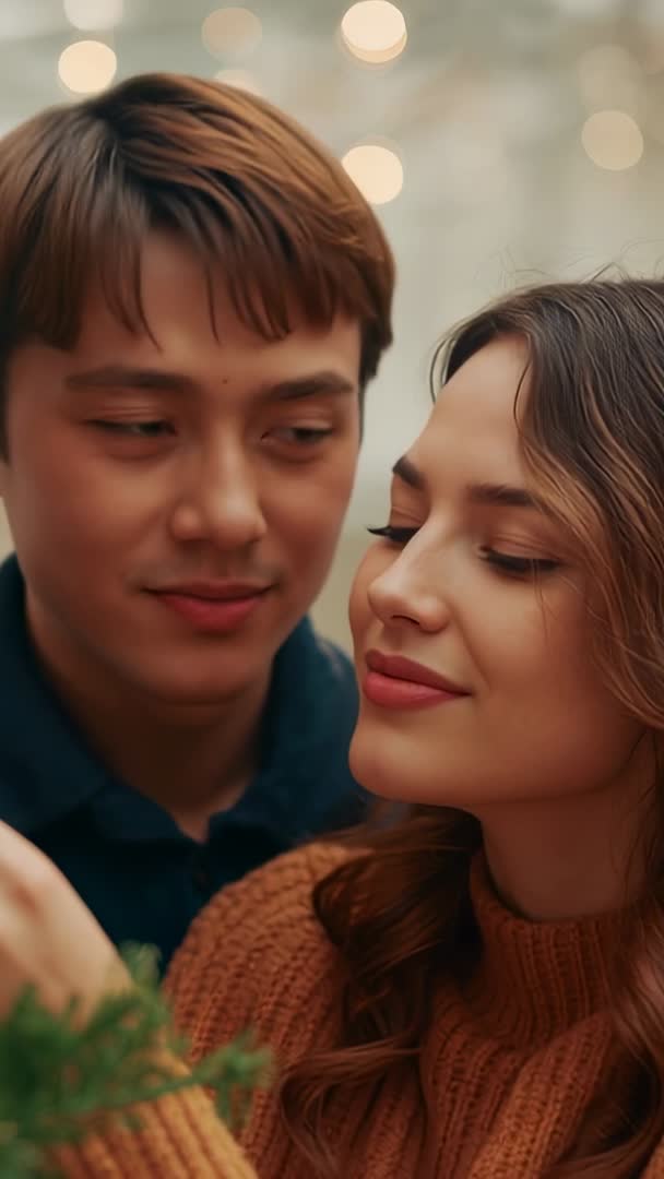 AI Generated Video. Capturing intimate couple decorating Christmas tree, hanging baubles and adjusting string lights against warm bokeh background. Conveying romantic, cozy, joyful mood with warm tones and shallow depth of field, close-up framing emphasizing facial expressions and connection. Ideal for holiday marketing campaigns, social media reels, Instagram Stories, TikTok and YouTube Shorts, greeting card animations, blog hero clips, retail seasonal promotions, lifestyle and relationship features. Useful as B-roll, opener clip, transition footage, or background for holiday product showcase and DIY decorating tutorials. Color grading friendly and optimized for vertical 9:16 mobile display.