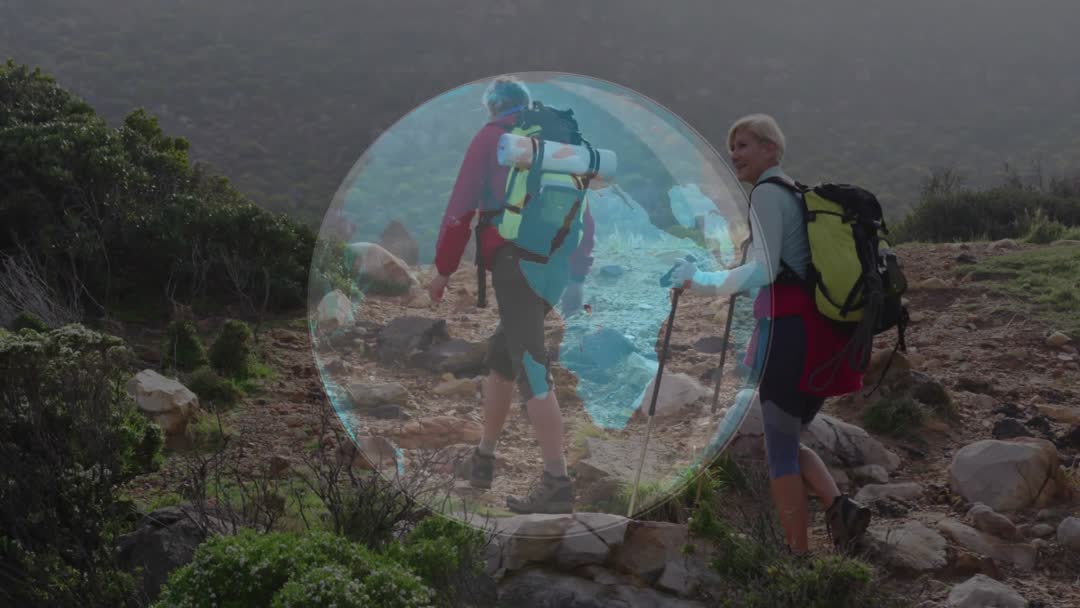 Couple Hiking Rocky Trail with Spinning Globe Overlay Video