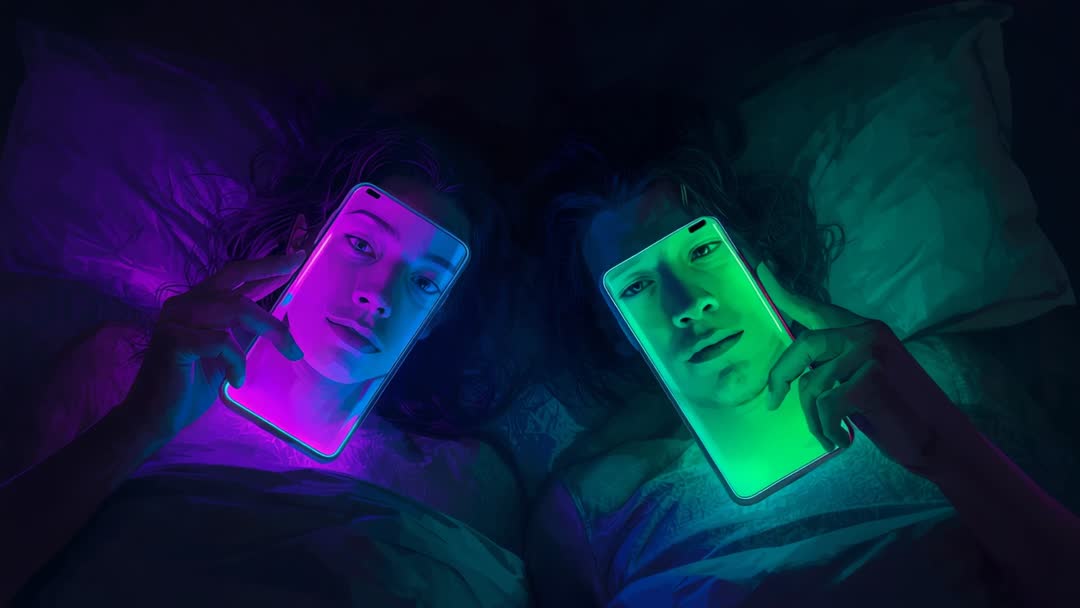 AI Generated Image. This video depicts a couple in a dark bedroom, holding devices with vibrant LED glows illuminating their faces in green and purple. Dominated by serene, soft lighting, it suggests themes of intimacy, technology, relaxation, and modern living, presenting a juxtaposition of togetherness and tech absorption. Suitable for topics around nighttime digital habits, relationships in modern contexts, or technological ambiance in personal spaces. The glowing colors add visual interest and are ideal for backgrounds or articles on these themes.