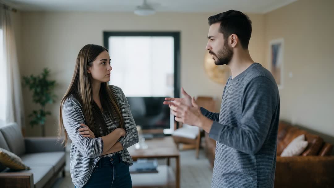 AI Generated Image. Video frame shows a couple engaged in a tense conversation at home. The man is expressing his emotions with gestures while the woman appears reflective with crossed arms. This situation illustrates relationship dynamics and the challenges of communication. Use for content focusing on relationship advice, communication strategies, or interpersonal conflict resolution.