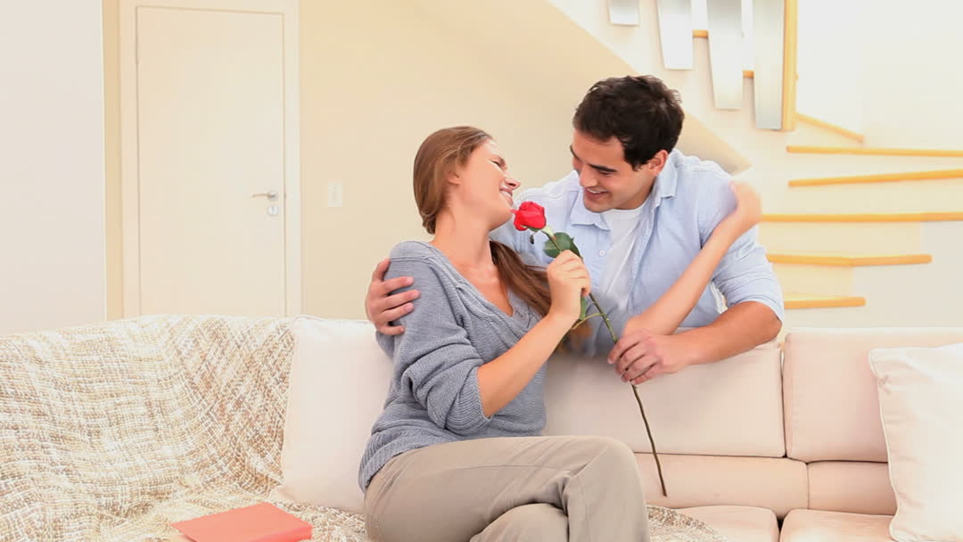 A man offers a red rose to his fiancée, sitting closely on a living room sofa. They display happy and loving expressions, perfect for illustrating romance or family relationships. Utilized in advertisements, romantic greeting cards, or flier design for relationship blogs, articles on building romantic gestures within relationships, or lifestyle magazines.