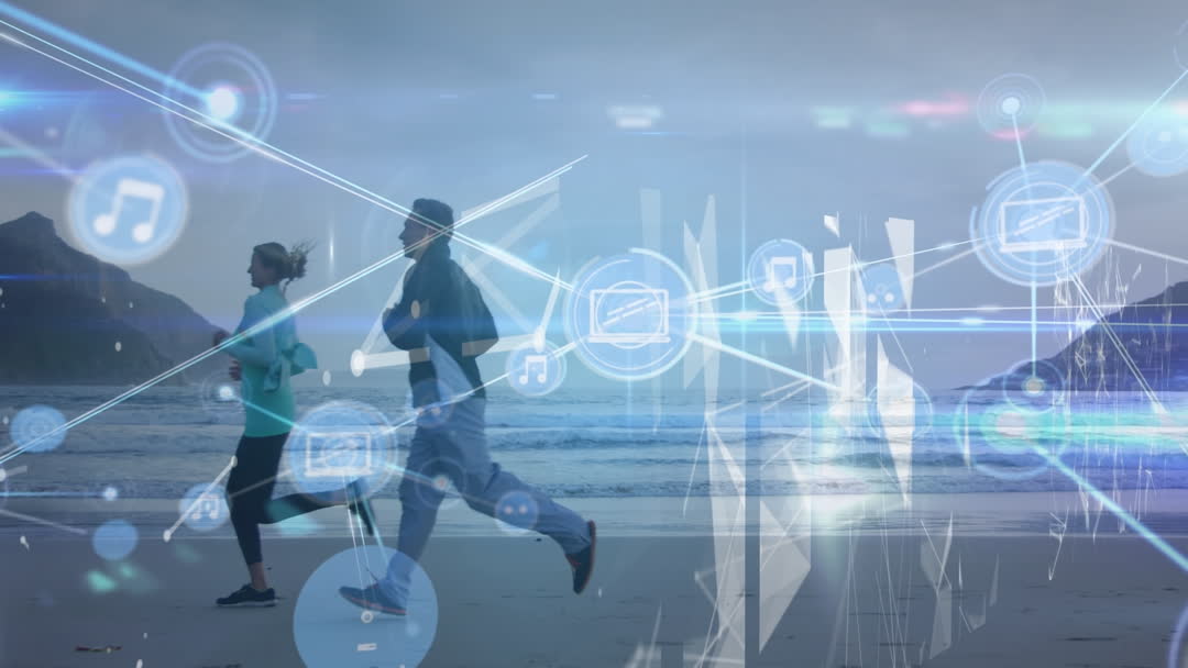 Abstract depiction of a Caucasian couple jogging on a beach with a digital interface overlay of network icons and connection lines. The videory suggests a blend of fitness activities and modern technology, symbolizing connectivity and a healthy lifestyle augmented by digital tools. Ideal for use in lifestyle blogs, health and wellness websites, technology integration articles, or digital advertising related to fitness apps and devices.
