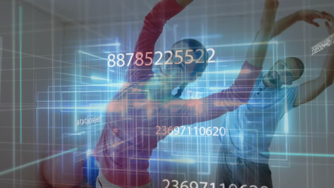Showing couple performing synchronized side stretch in sunlit gym while blue holographic grid visualizing motion and numeric data floating across frame. Capturing fluid movement and partner coordination for fitness, wellness, sports science, and wearable tech storytelling. Perfect for fitness app intros, wellness marketing, corporate wellness programs, online workout classes, sports technology demos, social media ads, and product pages. Editing suggestions: applying cool blue color grade, using slow-motion cuts, adding lower-third stats and pulsing soundtrack to enhance cinematic tech-driven vibe.
