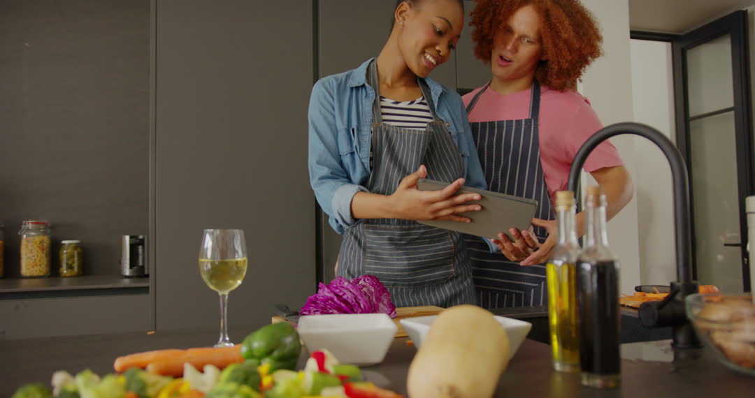 - Couple Preparing Meal Using Tablet for Recipe in Modern Kitchen