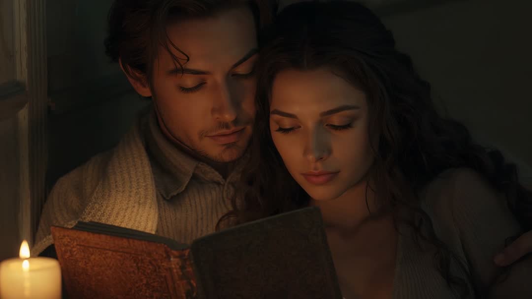 AI Generated Image. Couple sitting close, reading leather-bound book by candlelight, faces warmed by soft golden glow. Man wearing knit sweater and woman wearing blouse, leaning together while turning pages slowly and sharing quiet focus. Shot offering intimate, nostalgic mood with low-key lighting and warm color tones. Useful for romantic short films, period drama scenes, bookshop or publisher promos, audiobook campaigns, dating or relationship content, cozy winter advertising, mindfulness and slow living pieces, blog headers, social media reels, website hero banners, and editorial spreads. Ideal for slow pans, gentle rack focus, close-up coverage, and cinematic grading to emphasize warmth and closeness. Works well as visual metaphor for shared stories, emotional connection, evening routine, or quiet domestic moments.