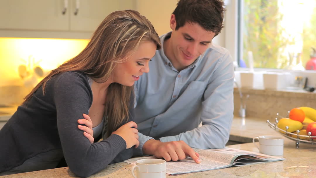 - Couple Reading Newspaper Together with Morning Coffee in Kitchen