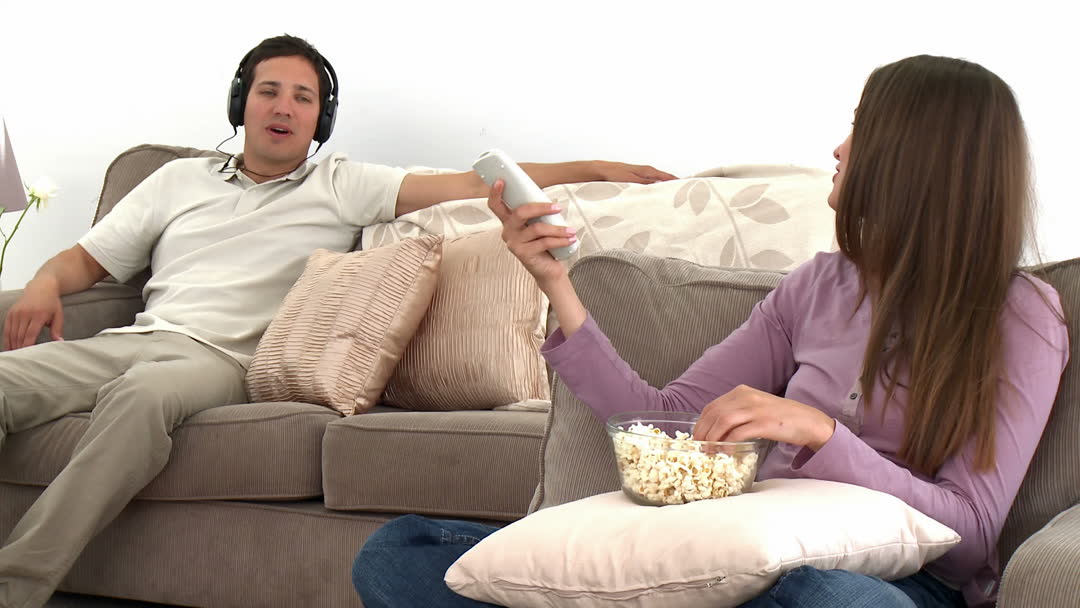 A couple is relaxing on the sofa at home while enjoying different hobbies. The woman is watching TV, holding a remote control and a bowl of popcorn, while the man is wearing headphones, presumably listening to music. This can be used in contexts related to everyday life, diverse interests within a relationship, or leisure time at home scenes.