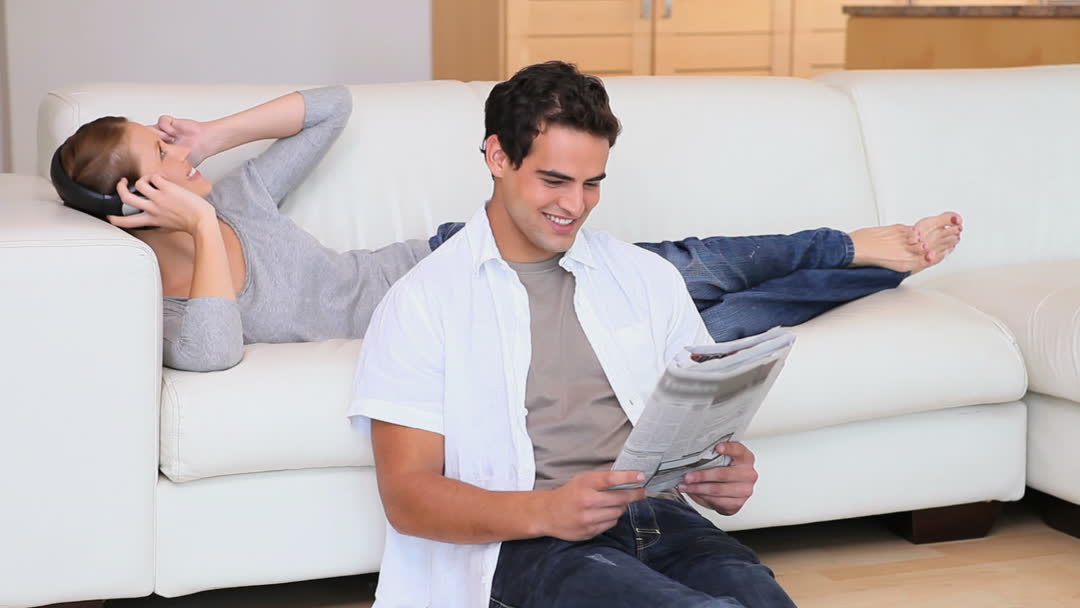 A man sits on the floor reading a newspaper while a woman reclines on a couch, listening to music with headphones. This scene depicts a cozy domestic moment illustrating digital lifestyle and couple's relaxation time. Useful for relationship articles, home lifestyle magazines, and marketing for casual home furnishings.