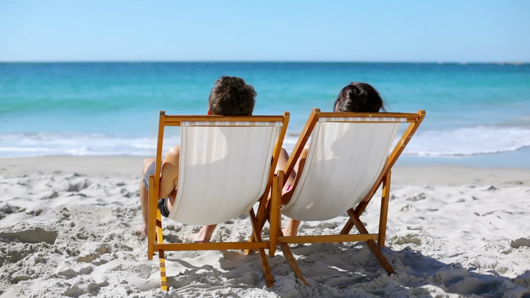 - Couple Relaxing in Deckchairs on Sandy Beach with Ocean View