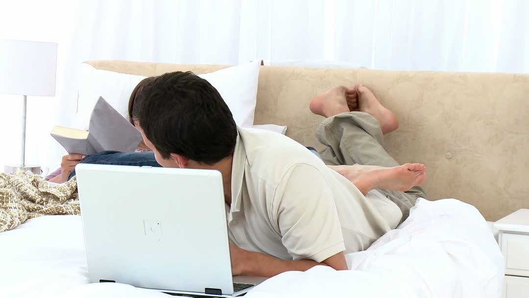 - Couple Relaxing on Bed with Book and Laptop