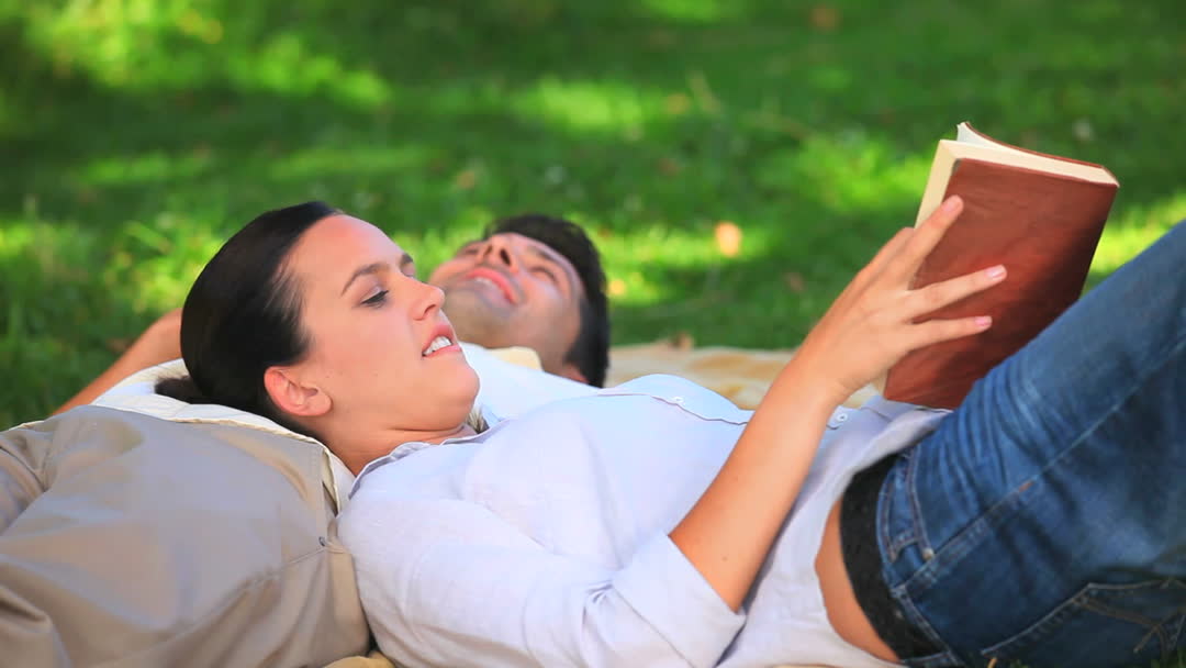 Couple is lying on a blanket in a park, with one reading a book peacefully. This video captures leisure and comfort amidst nature, perfect for illustrating themes of relaxation, outdoor activities, or romantic time spent together. Ideal for use in lifestyle blogs, tourism brochures, or promotion of outdoor events.