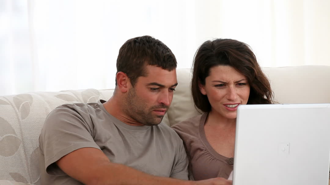 - Couple Relaxing on Sofa Watching Laptop Screen