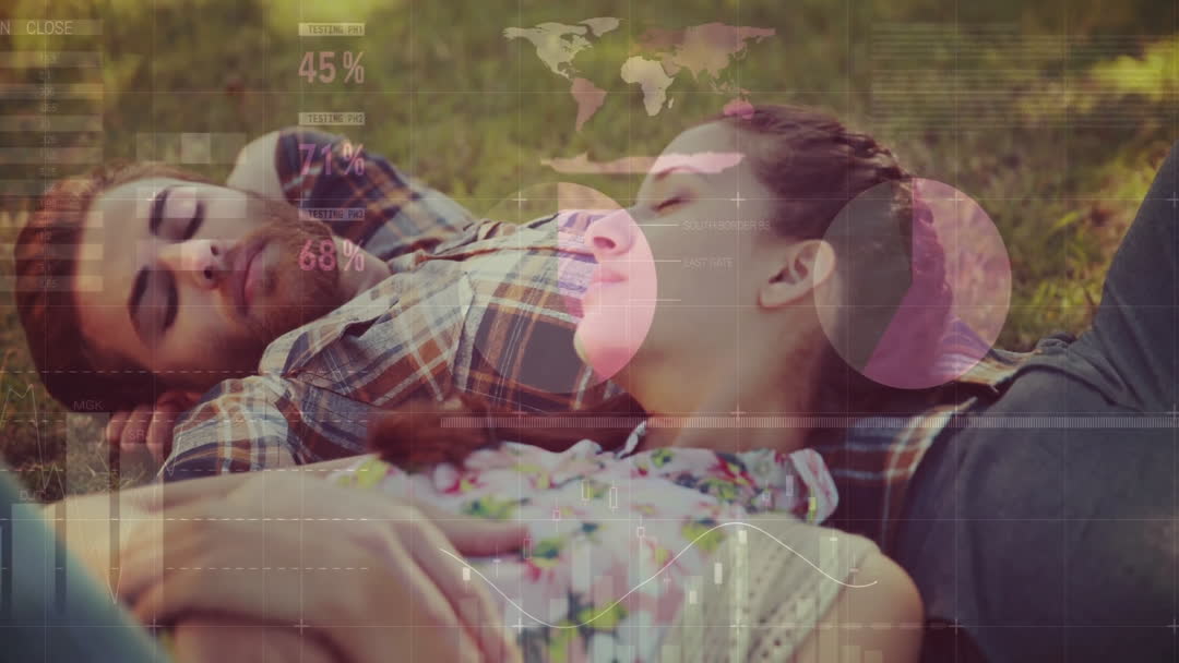 Young couple lying on grass during a picnic with digital overlay of financial charts and global data. Ideal for illustrating tech-driven lifestyle concepts, modern financial analysis presentations, or advertising intertwining nature and technology influence.