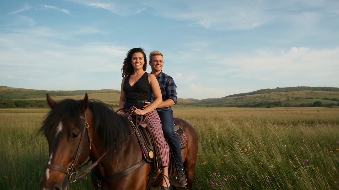 AI Generated Image. Camera approaching couple on brown horse riding through tall meadow at golden hour, both smiling and holding reins. Wide landscape framing with rolling hills and scattered wildflowers creating warm, pastoral mood. Footage showing comfortable tandem riding and natural connection between partners, ideal for romantic, travel, lifestyle, equine and outdoor leisure projects. Clip working well for website hero banners, social media ads, tourism promos, relationship blog headers, equestrian product commercials and wedding or engagement video montages. Color grading featuring warm tones, soft sky and natural motion delivering cinematic feel. Consider adding ambient music and gentle camera pan to emphasize motion and intimacy or using slow-motion cut for dramatic effect.