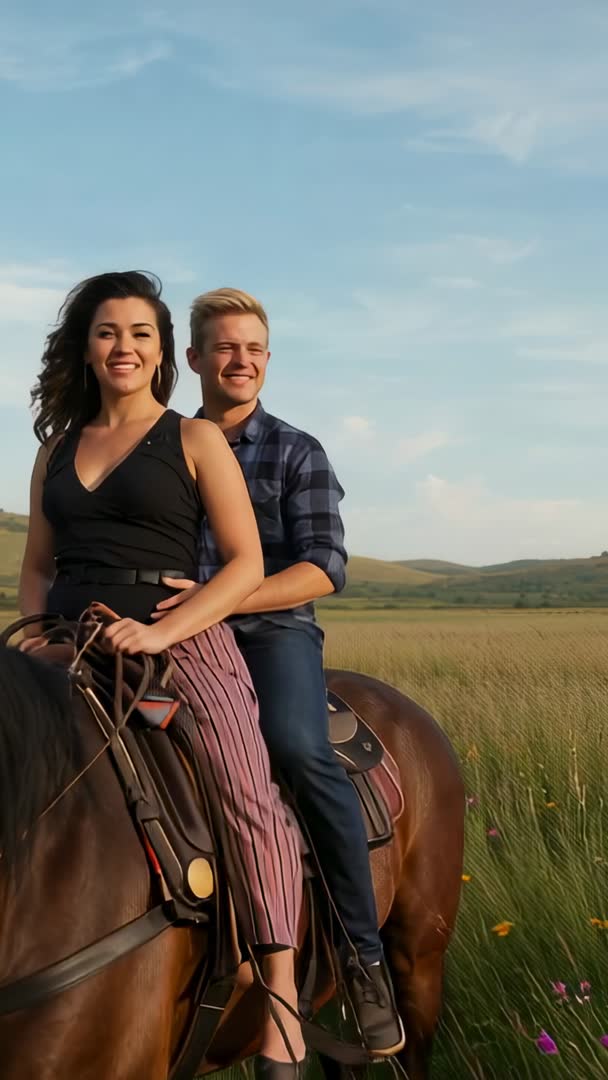 AI Generated Video. Vertical 9:16 video showing couple riding tandem on brown horse across sunlit wildflower meadow. Couple smiling and enjoying outdoor leisure while wearing casual clothing. Wide open rolling hills creating peaceful countryside backdrop and gentle breeze adding motion to tall grass and flowers. Footage working well for travel and tourism campaigns, lifestyle and dating apps, equestrian business promotion, social media reels and mobile ads. Clip fitting mobile-first content such as Instagram Reels, TikTok and vertical web banners. Editing suggestions include warm color grade, gentle camera pan or slow zoom, and overlay text for headline or call to action. Licensing ideas include commercial advertising, editorial pieces on travel and outdoor recreation, lifestyle blog headers, and romantic getaway promotions.