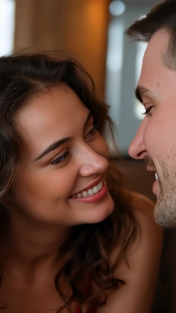 AI Generated Video. Young couple leaning close on couch, sharing warm smiles and gentle eye contact. Woman in red top lowering gaze toward man while both smiling and radiating intimacy. Soft bokeh background and warm ambient lighting creating cozy, romantic mood. Close-up vertical video clip capturing facial expressions, chemistry, and tender moment in mobile-friendly format. Use for romantic ads, dating app promos, relationship blog headers, social media reels, Valentine campaigns, lifestyle marketing, hotel or lounge promotion, couple counseling content, wedding teaser clips, and storytelling montages. Clip works well as emotional opener, background cutaway for interviews about relationships, or insert shot to add warmth to brand videos. Shot features shallow depth of field, natural skin tones, and intimate portrait framing for strong viewer connection.