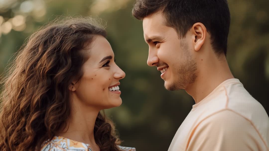 AI Generated Image. This video frame captures a heartwarming moment between a couple gazing affectionately at each other, nestled in a park setting under a lush, natural backdrop. Their smiles reflect genuine romance and emotional connection, adding a touch of warmth and tenderness to the scene. Perfect for use in content focused on love, relationships, or outdoor bliss. Ideal for romance or relationship-related advertisements, blogs about dating tips, or lifestyle magazines.