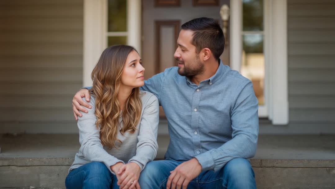 AI Generated Video. Showing young couple sitting on front porch steps, man keeping arm around partner while they share calm conversation and steady eye contact. Capturing warm natural light and shallow depth of field that isolates subjects against soft home facade. Conveying themes of support, commitment, domestic life and emotional connection suitable for personal finance, real estate, relationship advice, mental health and lifestyle content. Ideal for video intros, b-roll, social media reels, ad banners, blog headers and promotional spots highlighting homeownership, couple counseling or family planning. Providing room for text overlay on left side and easy color grading for warm tones.
