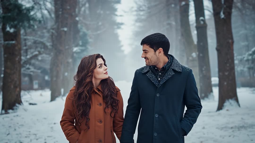 - Couple Sharing Romantic Walk in Snowy Evergreen Forest