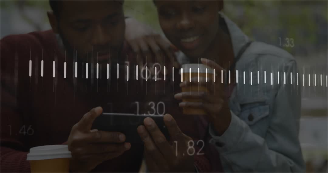 A couple is sitting at a cafe, sharing a moment as they focus on a smartphone screen. Transparent finance data bars float in front of them, suggesting they are analyzing financial information together. This video represents romance intertwined with technology, modern urban life, and digital connectivity. Ideal for illustrating themes related to finance, technology, relationship dynamics, or modern lifestyles.