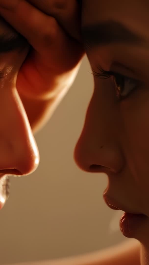 AI Generated Video. Closeup vertical video showing intimate moment between couple as man lifts ringed hand to soothe partner brow. Warm studio light creating soft glow on faces and highlighting eyelashes and lips. Camera focusing on gentle touch and mutual gaze, conveying trust, comfort, and romantic tension. Ideal for use in relationship, wellness, mental health, and dating campaigns, advertising, social media reels, cinematic intros, and soundtrack-driven short films. Useful for hero banners, background loops for counseling websites, promotional reels for jewelry or wedding services, blog headers about emotional connection, and ad spots for couples therapy or romance novels. Color grading options allowing warm tonal palette or cooler desaturation for more dramatic mood. Vertical format optimized for mobile-first platforms and social stories.