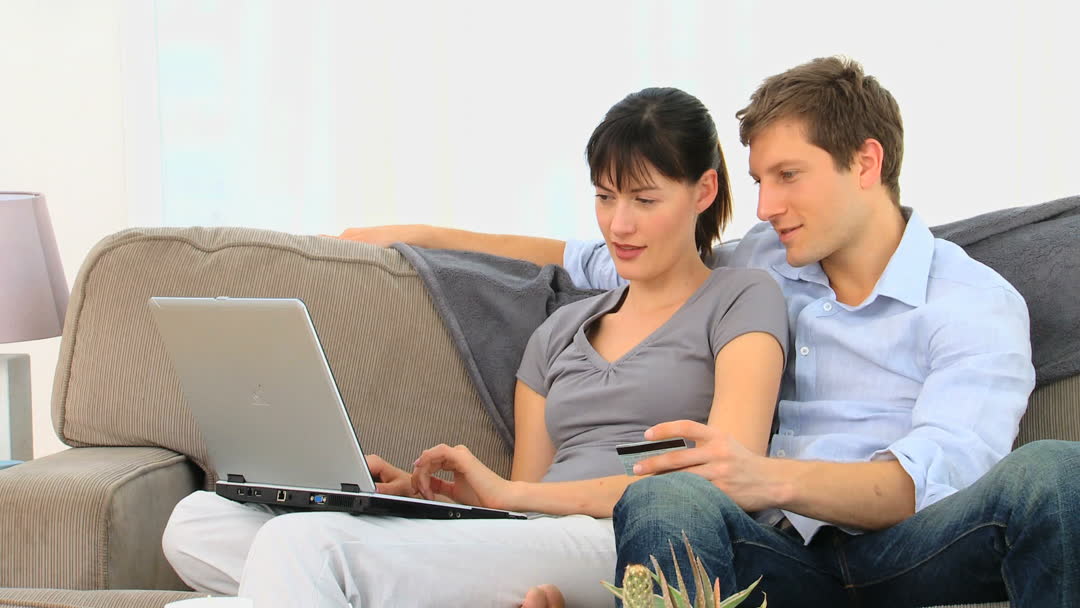 - Couple Shopping Online Relaxed on Sofa with Laptop and Credit Card