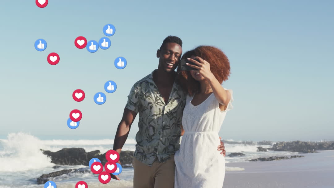 Joyful scene of a couple enjoying their time at the beach as social media 'like' and 'love' icons float around them. Great for concepts related to digital connectivity, relationships, vacations, and the impact of social media on human experiences. Ideal for marketing campaigns, blog posts about modern relationships, or lifestyle brands.