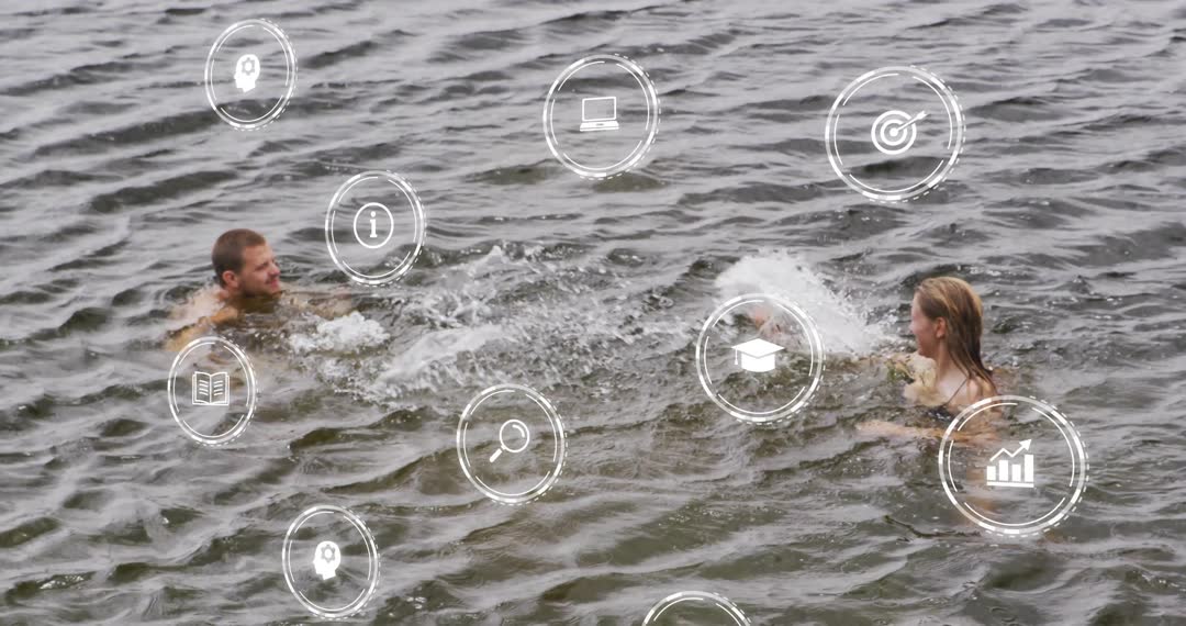 Two people are playfully splashing each other while wading in a calm lake, surrounded by white educational and digital icons creating a futuristic and technological theme. Overlay symbols such as lamps, computers, charts highlight the concept of mixing traditional fun with modern technology. This visual could be ideal for advertisements aiming to target youthful, tech-savvy audiences seeking a blend of education and lifestyle content or could be used in campaigns promoting educational apps merging outdoor experiences with digital interactivity.