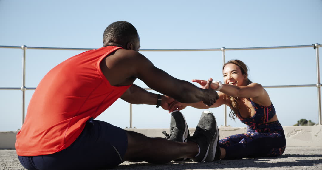 Multi-ethnic couple engaging in a stretching routine on a sunny beachside promenade. Depicts a vibrant and healthy outdoor lifestyle, perfect for websites or articles on fitness, relationship bonding, or wellness activities.