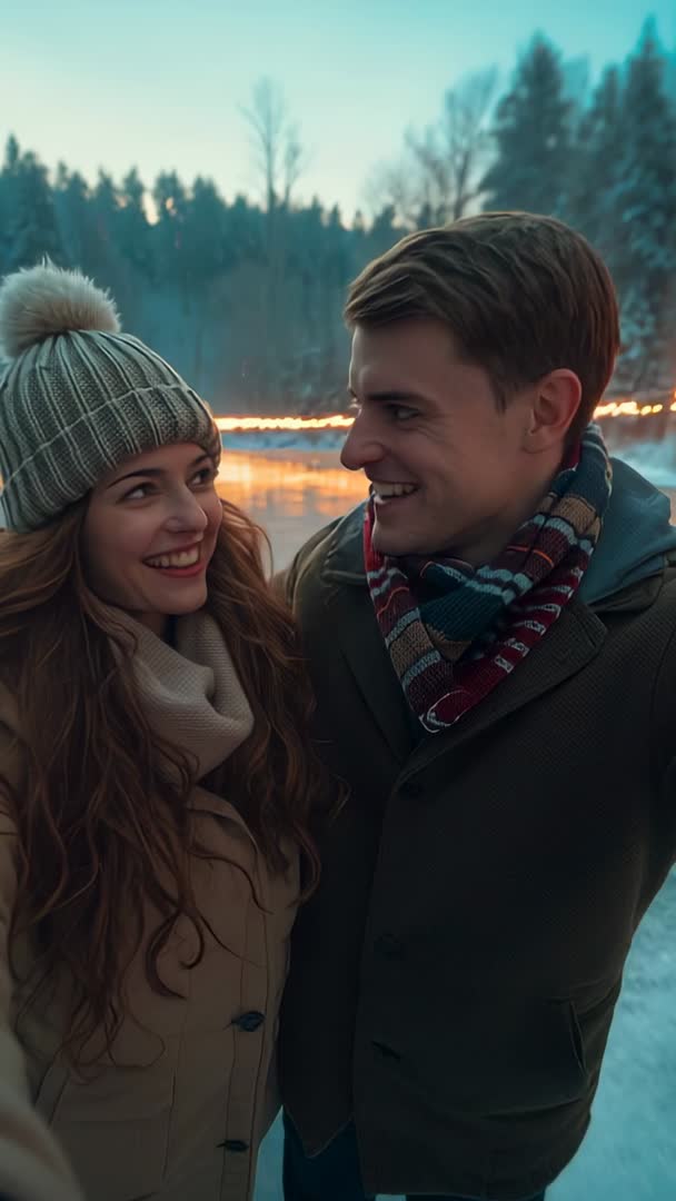 - Couple Taking Selfie on Frozen Lake at Dusk with String Lights — Winter Romance Vertical Video