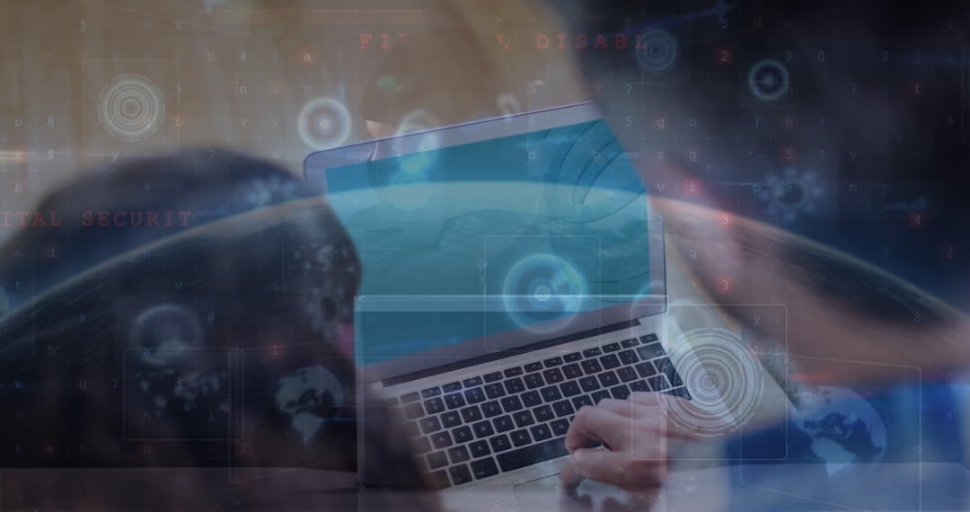 A realistic depiction of a couple engaged with a laptop, overlaid with data processing and digital interface icons suggesting themes of technology and global connectivity. Excellent for themes on cybersecurity, future technology trends, or digital collaboration in a global business environment. Ideal for marketing in tech sectors, education on digital interaction, or visuals in stories about online connectivity.
