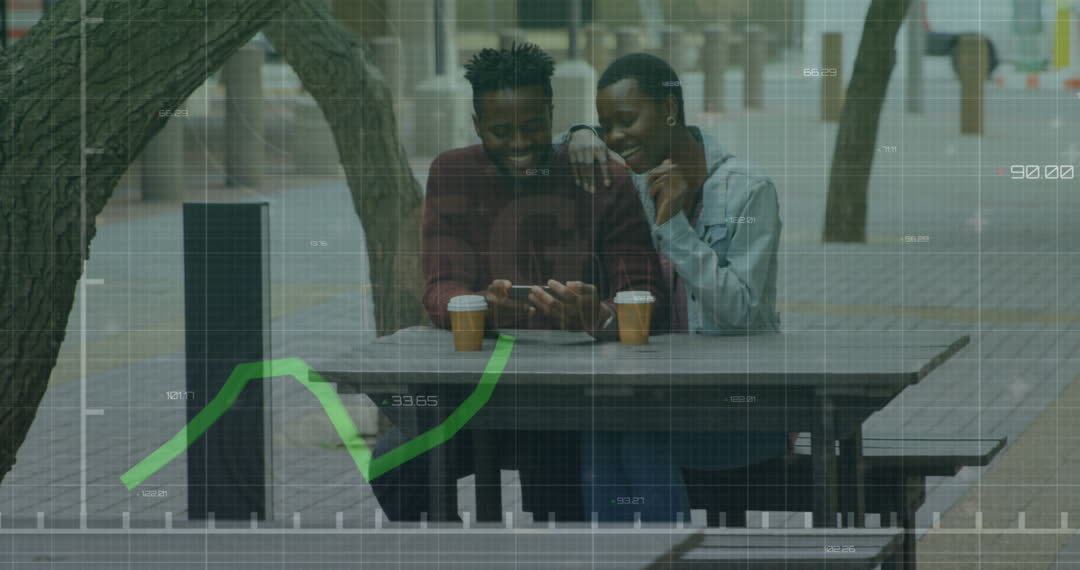 Couple sitting at table using smartphone, overlayed with dynamic data graphics. Ideal for illustrating technology use in social situations, data analysis, or tech-infused lifestyle videory. Perfect for content on digital marketing, mobile device use, and modern relationships.