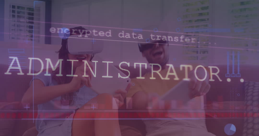 Couple seated wearing virtual reality headsets while engaging with digital devices. Visible text overlays include encrypted data processing and administrative phrases, creating a blend of virtual and augmented reality themes. Ideal for use in technology blogs, innovation workshops, or digital transformation presentations emphasizing advanced tech and user interaction.