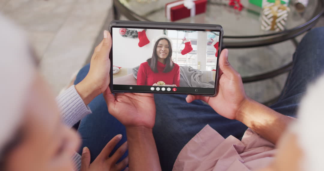 - Couple Video Calling Friend for Virtual Christmas Celebration