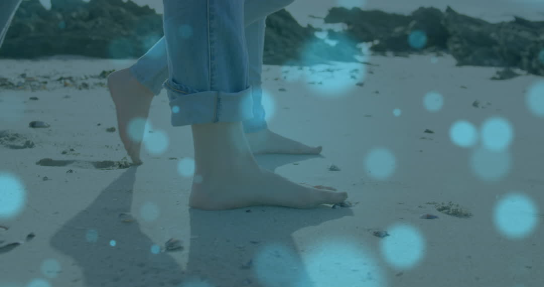 A couple is walking barefoot on a sandy beach with rolled-up jeans, enjoying a serene and peaceful experience. The decorative light spots overlay adds a whimsical or dreamy touch to the scene. This visual element can be used to represent themes of relaxation and escape, ideal for campaigns focused on holidays, vacation packages, romantic getaways or serene lifestyles.