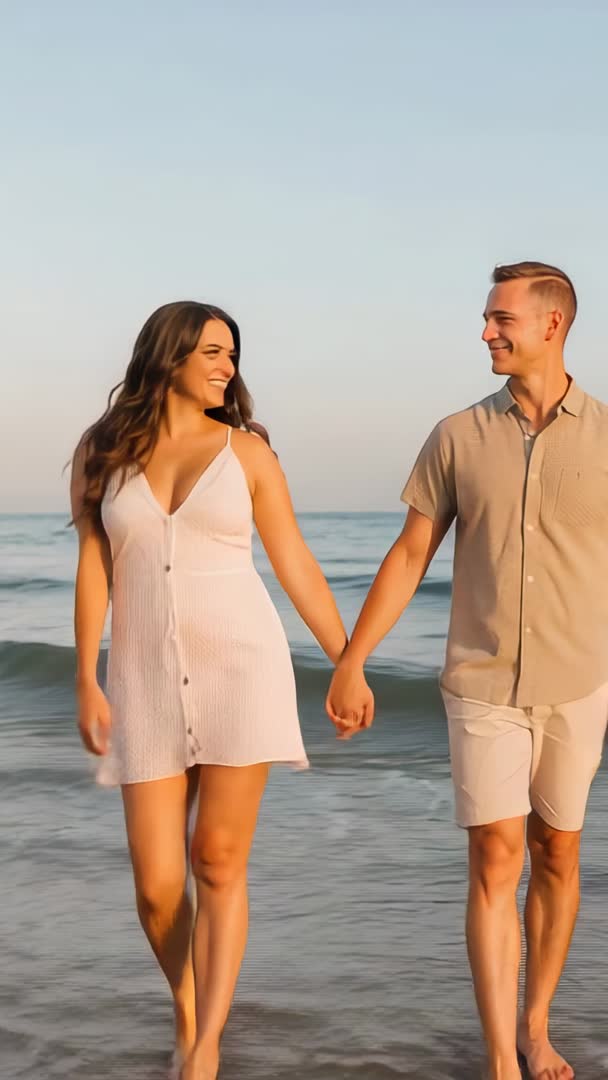 AI Generated Video. Footage capturing couple walking hand-in-hand along sunlit shoreline at golden hour, smiling and looking at each other. Warm light bathing skin while gentle waves lap at feet, creating calm and romantic atmosphere. Vertical orientation optimized for mobile platforms and social reels, leaving room for text overlay and logo placement in upper portion of frame. Color palette featuring warm golden tones and soft ocean blues, offering cinematic and aspirational mood. Ideal for travel and tourism promotions, lifestyle and relationship content, wedding teaser clips, dating app creatives, hotel and resort marketing, romantic getaway adverts, social media reels and stories, and hero video placements on websites or landing pages.