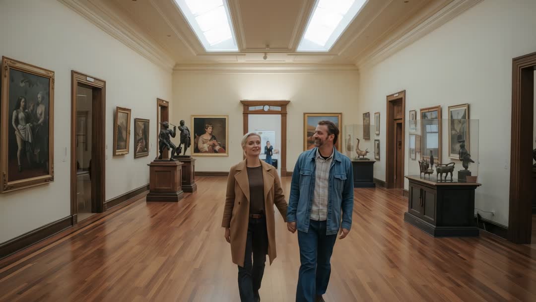 AI Generated Video. Walking hand-in-hand through museum gallery, couple admiring classical paintings and bronze sculptures under soft skylight daylight. Camera following couple strolling along polished hardwood floor, exchanging smiles and quiet conversation. Wardrobe featuring tan overcoat and denim jacket, suggesting relaxed urban style. Clip capturing gentle, intimate mood suitable for slow pans and ambient sound. Usage ideas: travel and tourism promos, museum marketing clips, lifestyle and romance social media reels, cultural event advertising, editorial features on art and date ideas, virtual tour intros, hospitality and city tourism campaigns. Suggested edits: apply warm color grade, slow camera movement, and subtle piano soundtrack to enhance romantic, contemplative atmosphere. Ideal for homepage hero clips, Instagram reels, video ads, blog headers, and promotional presentations.