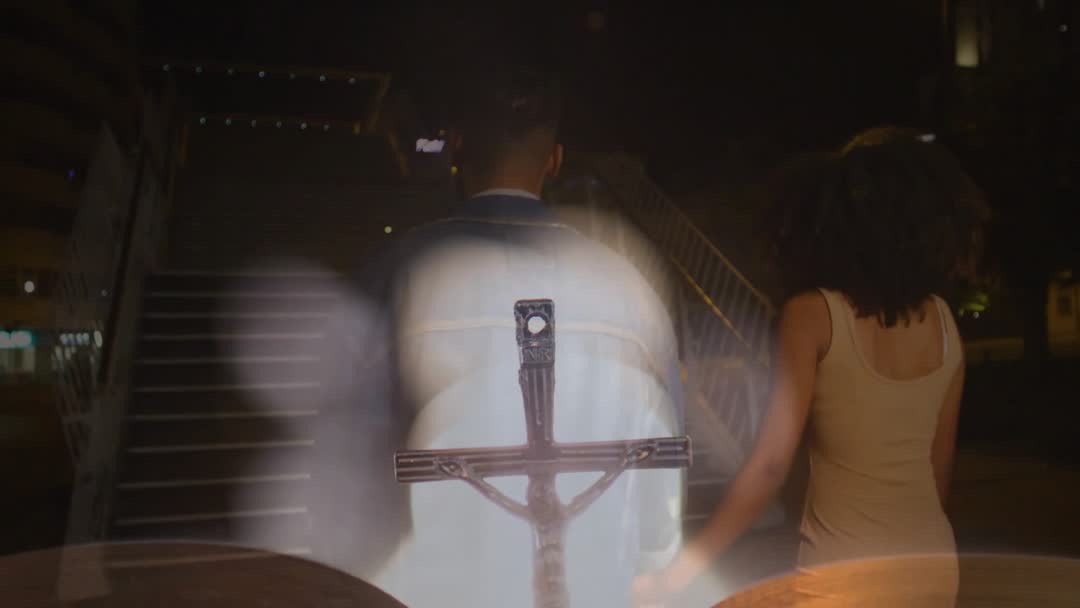 Scene shows a couple walking hand in hand through a plaza at night, with an overlay of a glowing cross, suggesting a blend of romance and spirituality in an urban environment. Ideal for conveying themes of companionship, faith, and serene nightlife, suitable for use in content about relationships, spiritual journeys, or urban exploration settings.
