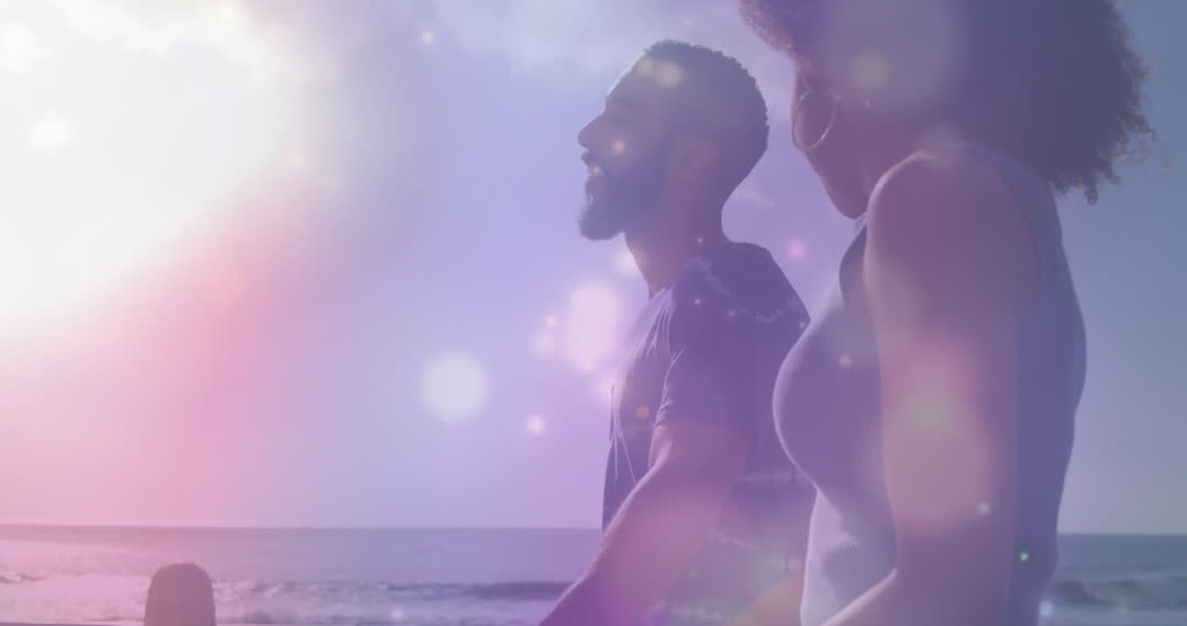 This video depicts a couple of African descent enjoying a calm walk on a beach, accented by a surreal overlay of shimmering light spots. Ideal for use in projects concerning relationships, love, or vacation vibes. It can be featured in advertisements for travel and tourism to suggest peaceful retreats or romantic getaways.