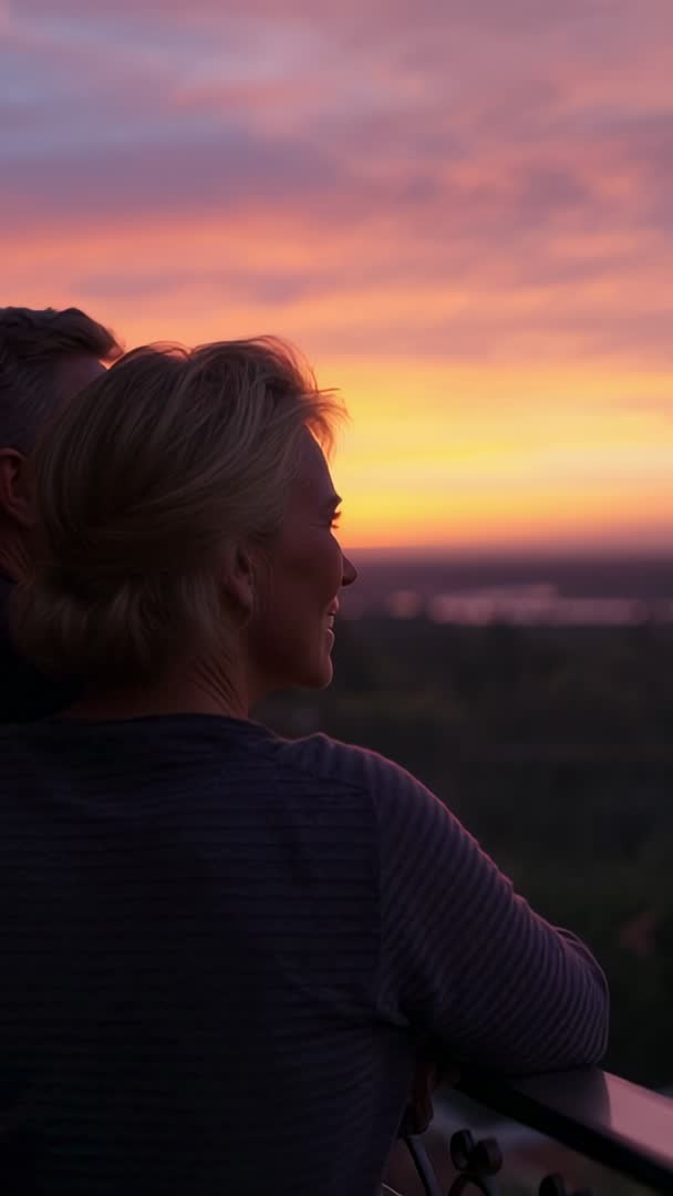 AI Generated Video. Featuring mature couple watching vibrant sunset from balcony, woman smiling and leaning on iron railing while enjoying panoramic view. Warm pink and orange sky reflecting on distant water, creating romantic, tranquil mood. Vertical video delivering cinematic portrait orientation ideal for mobile use, social media reels, Instagram stories, TikTok, vertical ads. Useful for travel promotions, real estate balcony showcase, lifestyle and retirement content, dating or romance campaigns, background for inspirational quotes, meditation or relaxation apps. Editing tips: use slow crossfade, soft music, subtle color grade to emphasize golden tones, add text overlay in upper area for headline or call to action. Recommended cropping for square and landscape repurposing when using for websites or marketing materials.