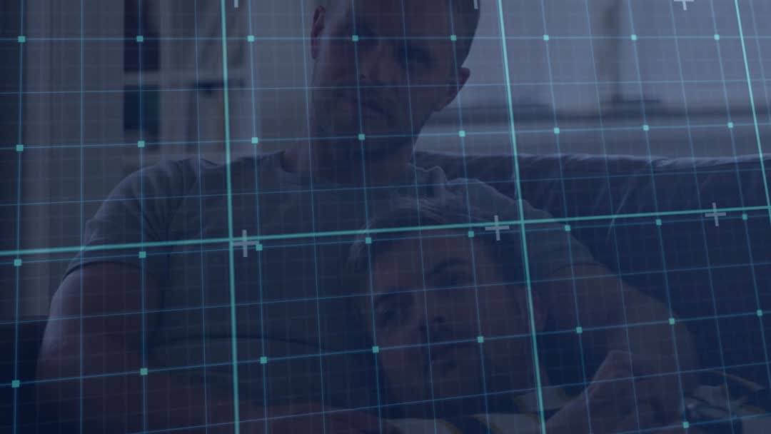 A romantic couple is seen resting on a couch, experiencing a moment of intimacy and calm as a technological grid overlay scans for face detection. This video represents themes of modern connection, relaxation, and the blend of personal relationships with emerging technology, making it suitable for use in contexts involving smart home technology, digital privacy, or innovations in relationship-enhancing technology solutions.