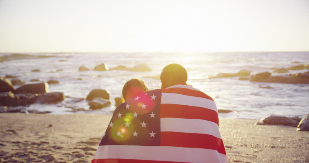 - Couple Wrapped in American Flag Enjoying Beach Sunset