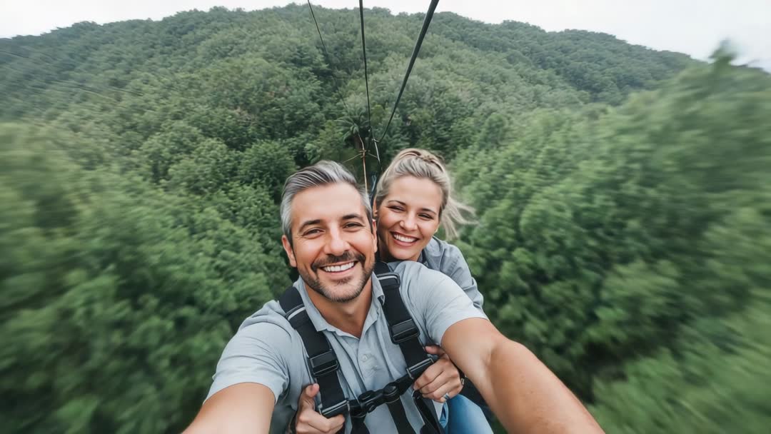 AI Generated Image. Couple zipping through dense green forest canopy, taking selfie while smiling and wearing safety harnesses. Front-facing action footage with strong motion blur on trees, conveying high speed, excitement, and joyful connection. Bright daylight and wide aerial perspective highlighting scale of landscape and intimate moment between two people. Suggested uses: travel and adventure tourism campaigns, social media reels and vlog openers, tour operator promotional videos, outdoor gear and safety equipment ads, lifestyle and adventure blog hero footage, experiential travel brochures, corporate retreat and team-building marketing, background B-roll for TV and digital commercials. Works well as attention-grabbing opener or cutaway shot to convey thrill, freedom, and outdoor exploration.