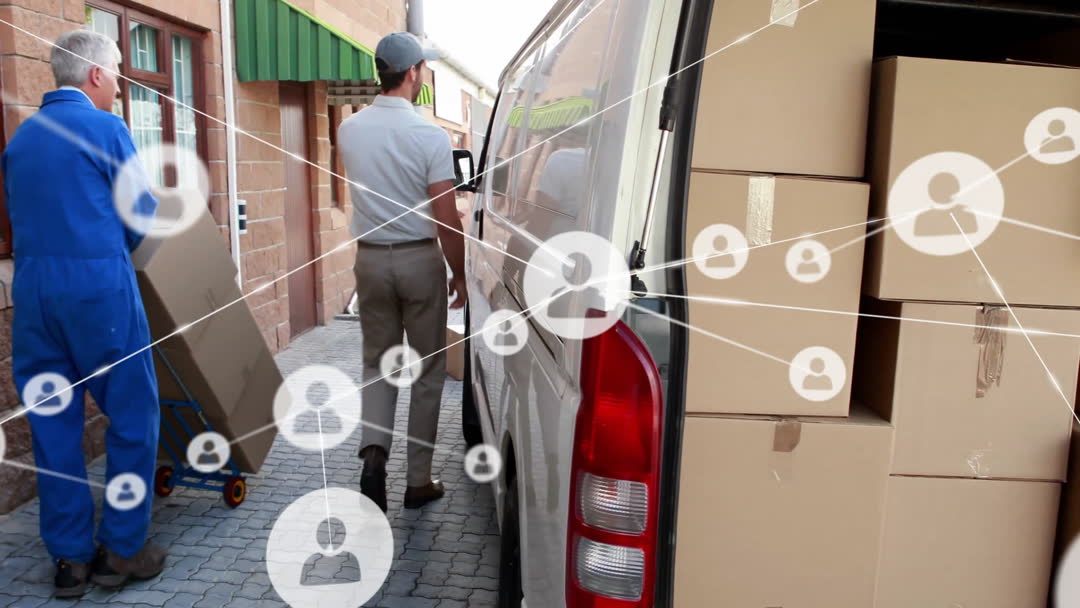 Warehouse employees are unloading boxes from a van, illustrating delivery efficiency and teamwork. Overlaid with a digital network to symbolize connectivity and modern logistics technology. Ideal for use in content about shipping services, supply chain management, digital transformation in logistics, or team collaboration tools.