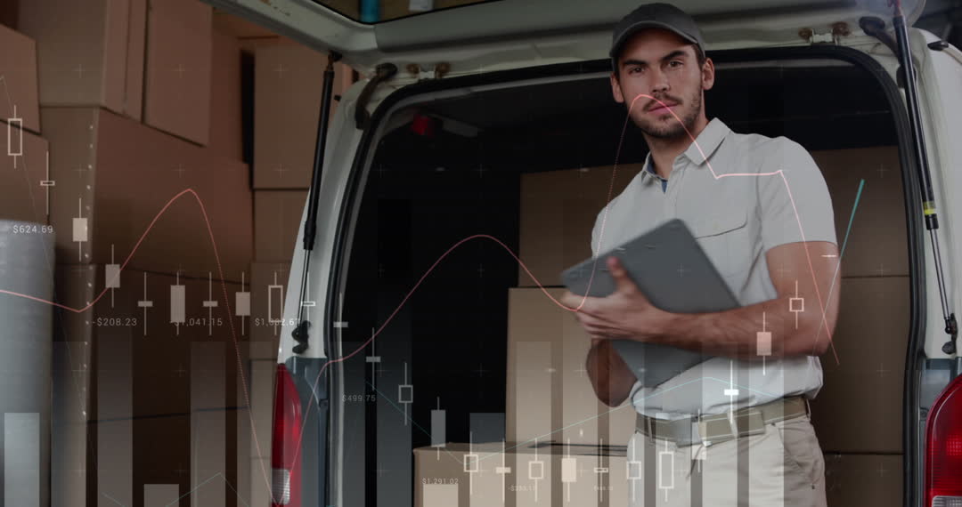 Courier managing deliveries amidst full vehicle showcasing overlay of financial data trends. Represents integration of technology and e-commerce logistics. Ideal for illustrating topics related to modern business strategies, delivery services innovations, or fiscal management in supply chain.
