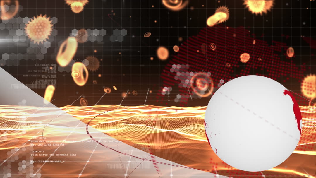 Animations depict COVID-19 cells interacting with digital elements on abstract landscape. Ideal for illustrating pandemic topics, scientific research, technology in healthcare, or data-driven analysis related arguments. Useful for educational and editorial content discussing virus impact and digital innovation.